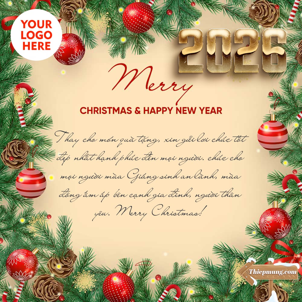 Mừng Gáng sinh và năm mới 2026 bằng thiệp giáng sinh cho cá nhân và doanh nghiệp. Tải logo công ty nếu có trên hình ảnh Merry Christmas and Happy New Year 2026 đẹp và ý nghĩa. Với thiết kế thiệp Giáng sinh đẹp nhất này với logo và thông tin công ty, mọi điều ước Giáng sinh của bạn sẽ thành hiện thực. Giờ đây, bạn có thể chỉnh sửa ảnh theo bất kỳ cách nào bạn muốn và gửi lời chúc Giáng sinh, năm mới 2026 đến khách hàng và đối tác của mình. Thiết kế thiệp Giáng sinh chuyên nghiệp với hình ảnh và lời chúc Giáng sinh của công ty rất dễ dàng, miễn phí và đảm bảo rất nhiều niềm vui.