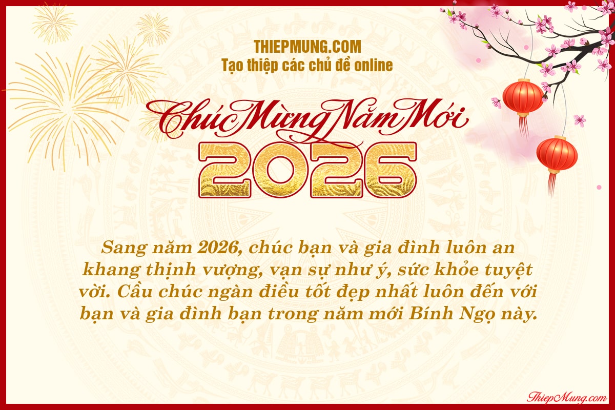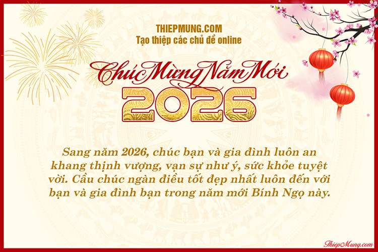 Tạo và tải thiệp chúc Tết, chúc mừng năm mới 2026 đẹp cho bạn bè và người thân của bạn. Những hình ảnh rực rỡ của hoa đào và pháo hoa tạo nên tấm thiệp chúc mừng năm mới 2026 ấn tượng. Viết những câu chúc năm mới 2026 hay trên thiệp sẽ là một món quà năm mới ấn tượng để bạn gửi tặng người thân và bạn bè. Trong những ngày giáp Tết, gia đình nào cũng đều tất bật với công việc trang hoàng nhà cửa, thay mới những thứ đã quá cũ kĩ để đón chào một năm mới trọn vẹn. Nhưng dù có bận rộn tới mấy cũng đừng quên tạo và chia sẻ thiệp chúc mừng năm mới 2026 đến những người thân yêu nhé.