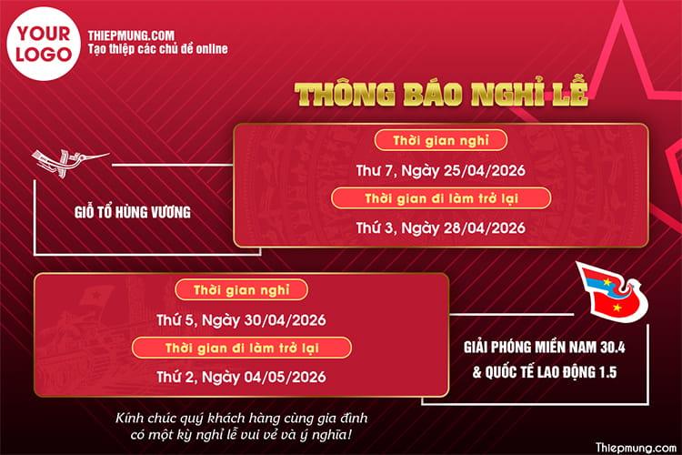 Tạo thông báo nghỉ lễ kết hợp Giỗ Tổ Hùng Vương, 30/4 và 1/5