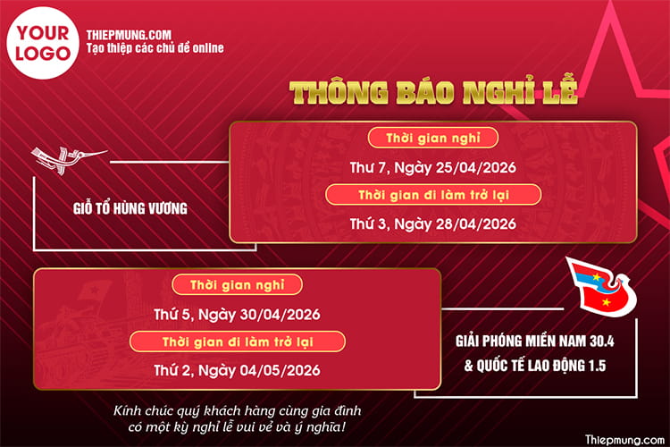 Mẫu thông báo nghỉ lễ Giỗ Tổ Hùng Vương, Giải phóng miền Nam 30/4 và Quốc tế Lao động 1/5 với thiết kế tông đỏ nổi bật, sang trọng và chuyên nghiệp. Bố cục rõ ràng phù hợp cho doanh nghiệp, cửa hàng, website và mạng xã hội. Banner thể hiện đầy đủ thời gian nghỉ và lịch làm việc trở lại, kết hợp hình ảnh biểu tượng dân tộc như trống đồng, cờ đỏ sao vàng, mang đậm tinh thần lễ hội Việt Nam. Tải ngay mẫu thông báo nghỉ lễ đẹp để sử dụng cho fanpage, in ấn hoặc gửi khách hàng.