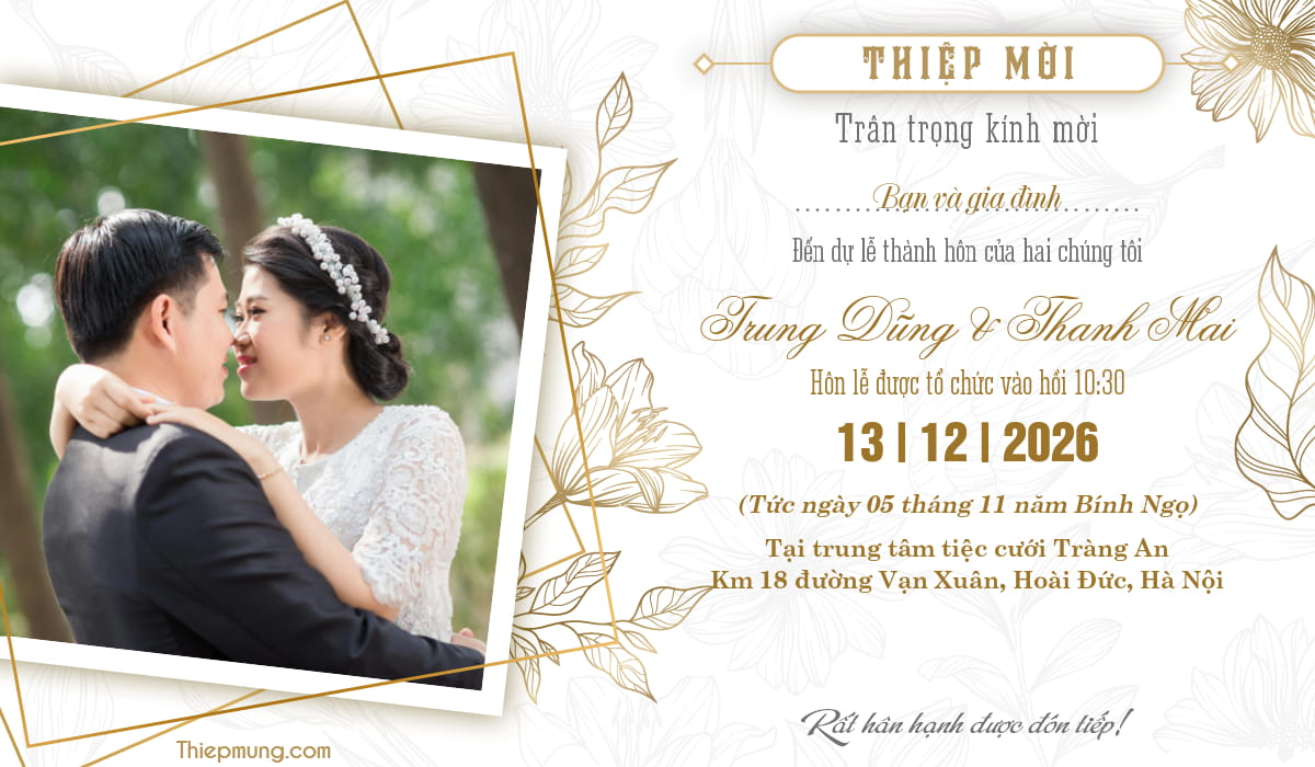 Tạo thiệp mời đám cưới cho bạn bè người thân đẹp miễn phí với thiết kế có sẵn của chúng tôi. Thiệp mời đám cưới online được trang trí hoa trang nhã lịch sự mà bạn có thể viết thông tin thư mời trên thiệp và gửi lời mời cưới đến mọi người qua mạng xã hội. Việc tạo thư mời cưới trực tuyến đã không còn quá xa lạ trong thời điểm công nghệ số lên ngôi và chúng ta giao tiếp kết nối với nhau qua mạng xã hội nhiều hơn. Cùng Thiệp Mừng chọn lọc từ hàng loạt thiết kế thiệp mời cưới có sẵn để khiến cho ngày vui của bạn nhận được lời chúc phúc của rất nhiều người.