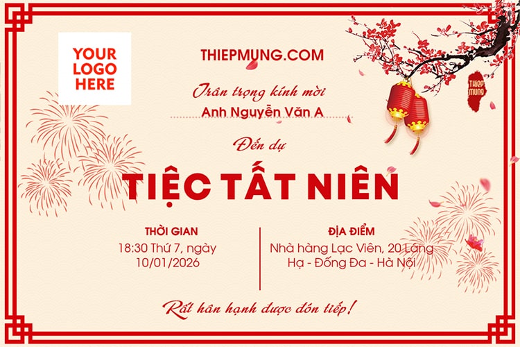 Bạn đang tìm kiếm thiệp mời tất niên cuối năm mẫu mới nhất? Đừng bỏ qua thiết kế thiệp mời tất niên được trang trí hoa đào và pháo hoa trực tuyến, tạo thư mời dự tiệc tất niên với đầy đủ nội dung thời gian, địa điểm, tên khách mời,...Gửi đến khách hàng, đối tác, nhân viên công ty đến với bữa tiệc tất niên cuối năm 2026 của công ty bạn với trình tạo thiệp tất niên miễn phí từ Thiệp Mừng.