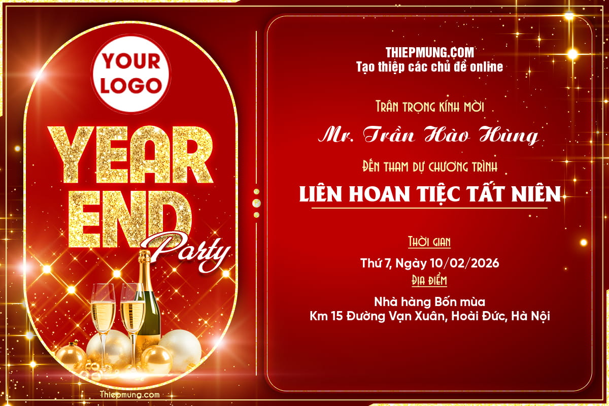 Mẫu thiệp mời Year End Party Liên hoan tiệc tất niên với thiết kế sang trọng, nổi bật tông đỏ ánh kim kết hợp vàng gold mang đến cảm giác đẳng cấp, ấm áp và không khí lễ hội cuối năm rực rỡ. Bố cục thiệp hiện đại, rõ ràng, giúp truyền tải đầy đủ thông tin sự kiện một cách trang trọng và chuyên nghiệp. Mẫu thiệp cho phép chèn logo doanh nghiệp, tên khách mời, thời gian và địa điểm tổ chức tiệc tất niên một cách linh hoạt. Nội dung trình bày mạch lạc, dễ đọc, phù hợp dùng làm thiệp mời online, gửi qua email, mạng xã hội hoặc in ấn thiệp giấy cao cấp.
