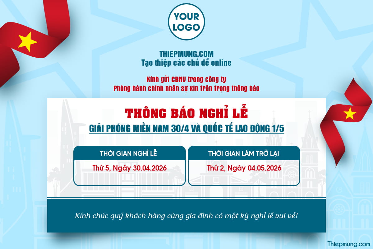 Tạo thông báo lịch nghỉ lễ Giải phóng Miền Nam 30/4 và Quốc tế Lao động 1/5 trang trong và hiện đại. Với các ưu điểm bố cục rõ ràng dễ nhìn, màu sắc hài hòa trang trọng, thông điệp truyền tải đầy đủ, chuyên nghiệp, có thể dễ dàng thay logo hoặc chỉnh ngày tháng. Bạn đang có mẫu thông báo nghỉ lễ 30/4 và 1/5 ấn tượng nhất năm nay.