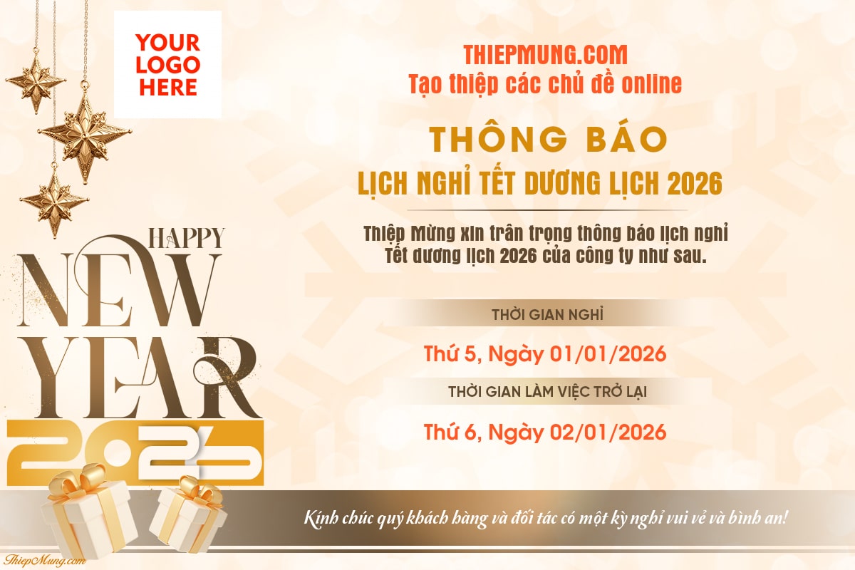 Tết Dương lịch 2026 đang đến gần, các doanh nghiệp, cơ sở giáo dục thường có nhu cầu gửi thông báo chính thức về lịch nghỉ lễ đến toàn thể cán bộ nhân viên và đối tác. Chuẩn bị một mẫu Thông báo nghỉ Tết Dương lịch 2026 rõ ràng, chuyên nghiệp là rất quan trọng để mọi người có thể nắm bắt và có kế hoạch phù hợp. Với mẫu Thông báo nghỉ Tết Dương lịch 2026 của Thiệp Mừng có đầy đủ các thông tin và kèm theo cả logo nữa. Chỉ mất một chút thời gian các bạn có thể tạo trực tuyến và tải về miễn phí.
