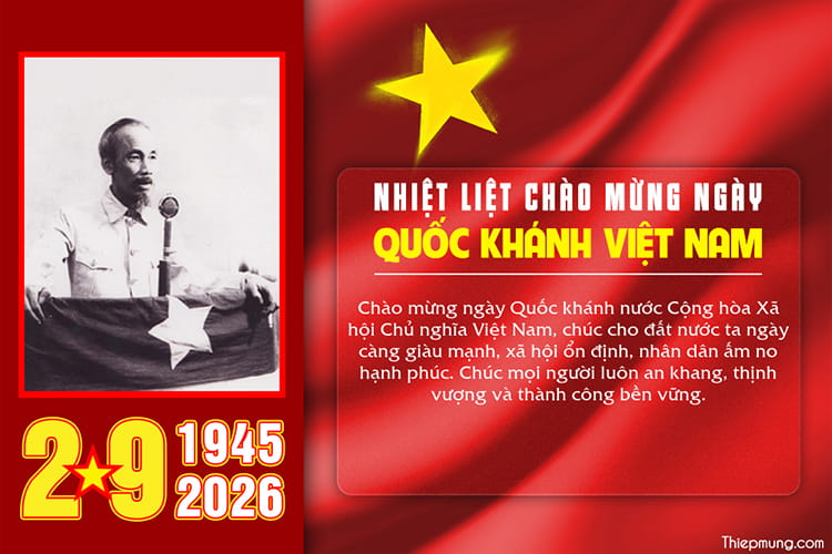 Tạo và tải miễn phí thiệp chúc mừng ngày Quốc khánh Việt Nam 2/9 với lá quốc kỳ Việt Nam, tạo thiệp chúc mừng ngày Quốc khánh trực tuyến và gửi lời tri ân đến công lao của những anh hùng hy sinh thầm lặng cho ngày độc lập của nước Việt Nam hôm nay. Hình ảnh thiệp chúc mừng ngày quốc khánh 2/9 dành tặng người thân, bạn bè, đồng nghiệp, khách hàng ấn tượng nhất.