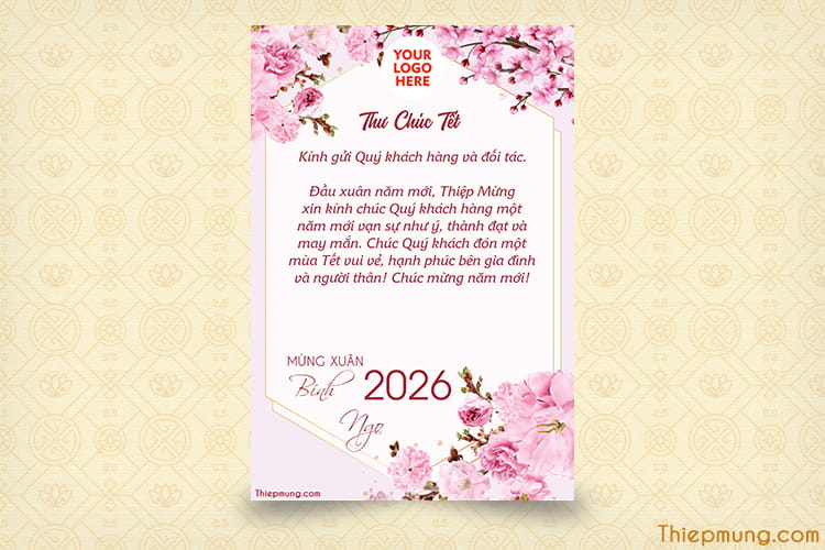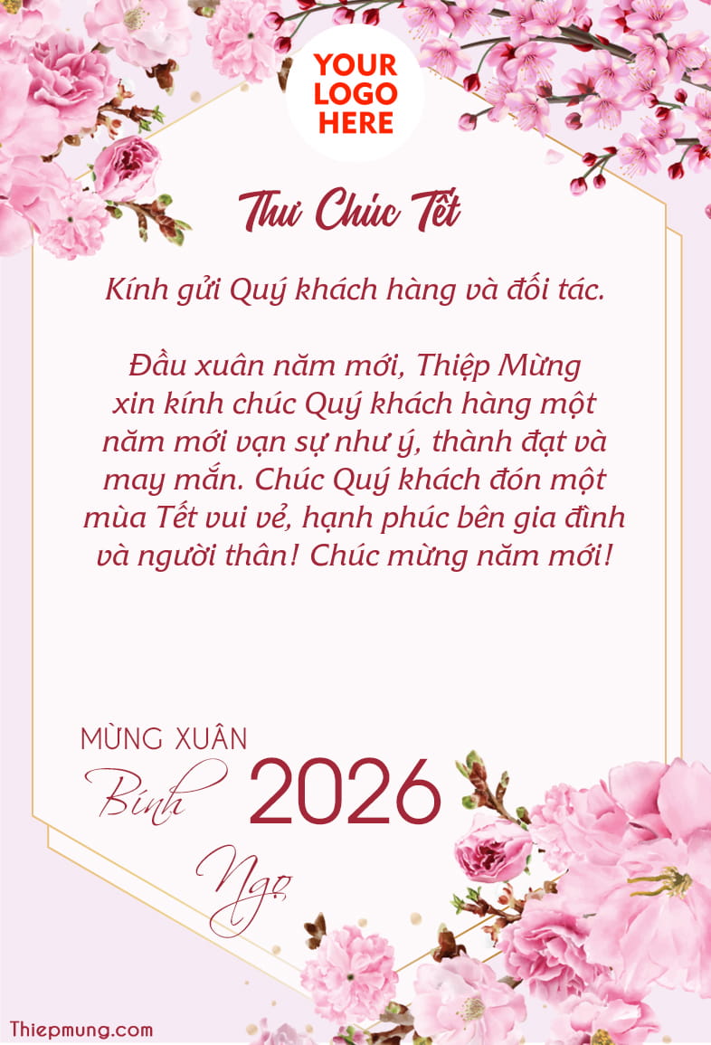 Tìm kiếm một cách tuyệt vời để gửi thư chúc Tết Nguyên Đán 2026 cho khách hàng của với logo công ty? Đây là nơi hoàn hảo để giúp bạn tạo ra những mẫu thư chúc Tết Bính Ngọ 2026 từ công ty cho khách hàng, đối tác của bạn. Tùy chỉnh thư chúc Tết và logo (nếu có) trên nền hoa đào chúc mừng năm mới 2026 của doanh nghiệp bạn thật hoàn hảo để gửi lời chào đến khách hàng và nhân viên của bạn dịp tết đến xuân về. Mẫu thư chúc Tết 2026 này là điều tuyệt vời duy trì mối quan hệ tốt với khách hàng bằng những cách chăm sóc đơn giản như mẫu thư chúc khách hàng năm mới với thiệp đẹp.