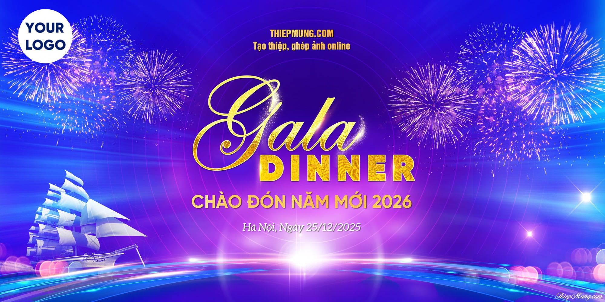 Mẫu backdrop Gala Dinner chuyên nghiệp thiết kế sang trọng với tông xanh tím hiện đại, chữ vàng nổi bật, pháo hoa rực rỡ và không gian lễ hội đẳng cấp. Phù hợp cho tiệc tất niên, sự kiện doanh nghiệp, gala dinner cuối năm. Tạo backdrop online nhanh chóng, chuyên nghiệp nhanh chóng và đơn giản tại Thiepmung.com.