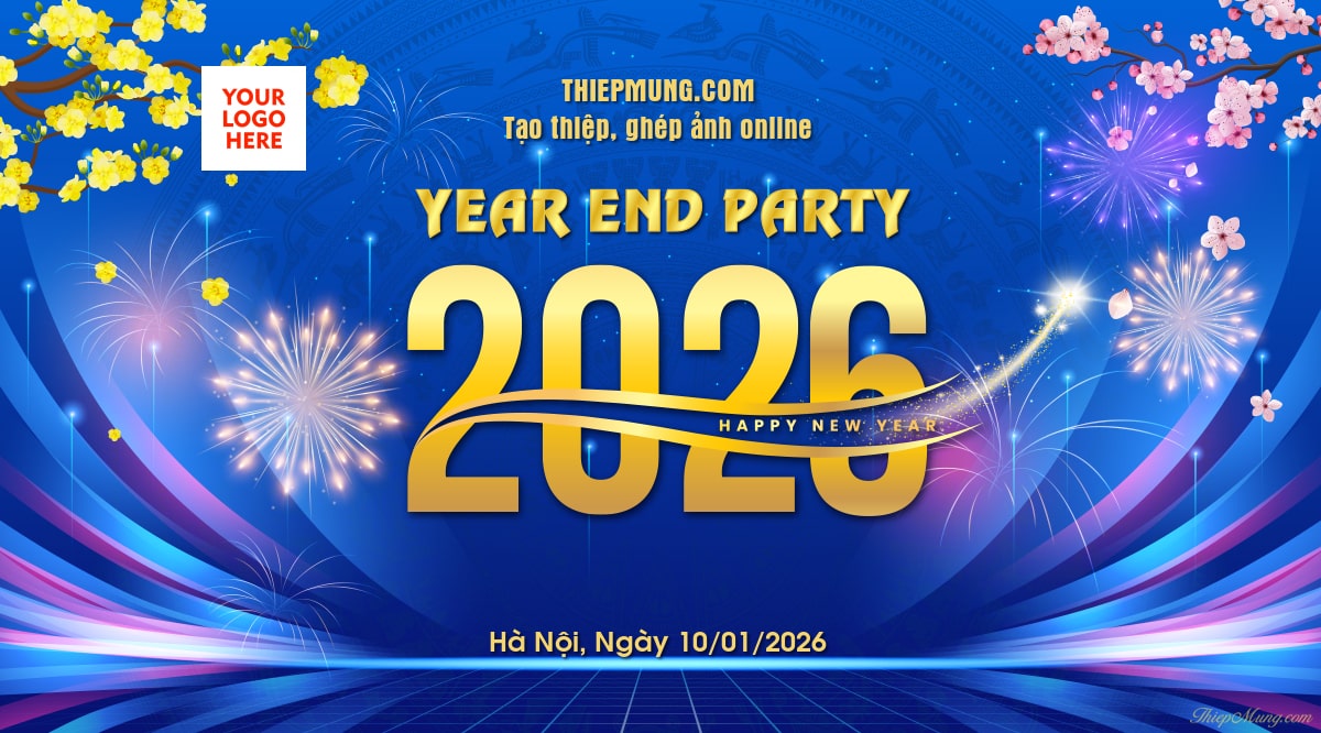 Mẫu thiết kế backdrop Year End Party dành cho sự kiện tiệc tất niên cuối năm 2025 và chào đón năm mới 2026. Tạo backdrop Year End Party trực tuyến được thiết kế nổi bật với phong cách hiện đại nhưng vẫn mang những nét đặc trưng của Tết cổ truyền dân tộc. Trang trí sân khấu tất niên sẽ trở nên hoành tráng hơn với mẫu backdrop Year End Party này của Thiệp Mừng.