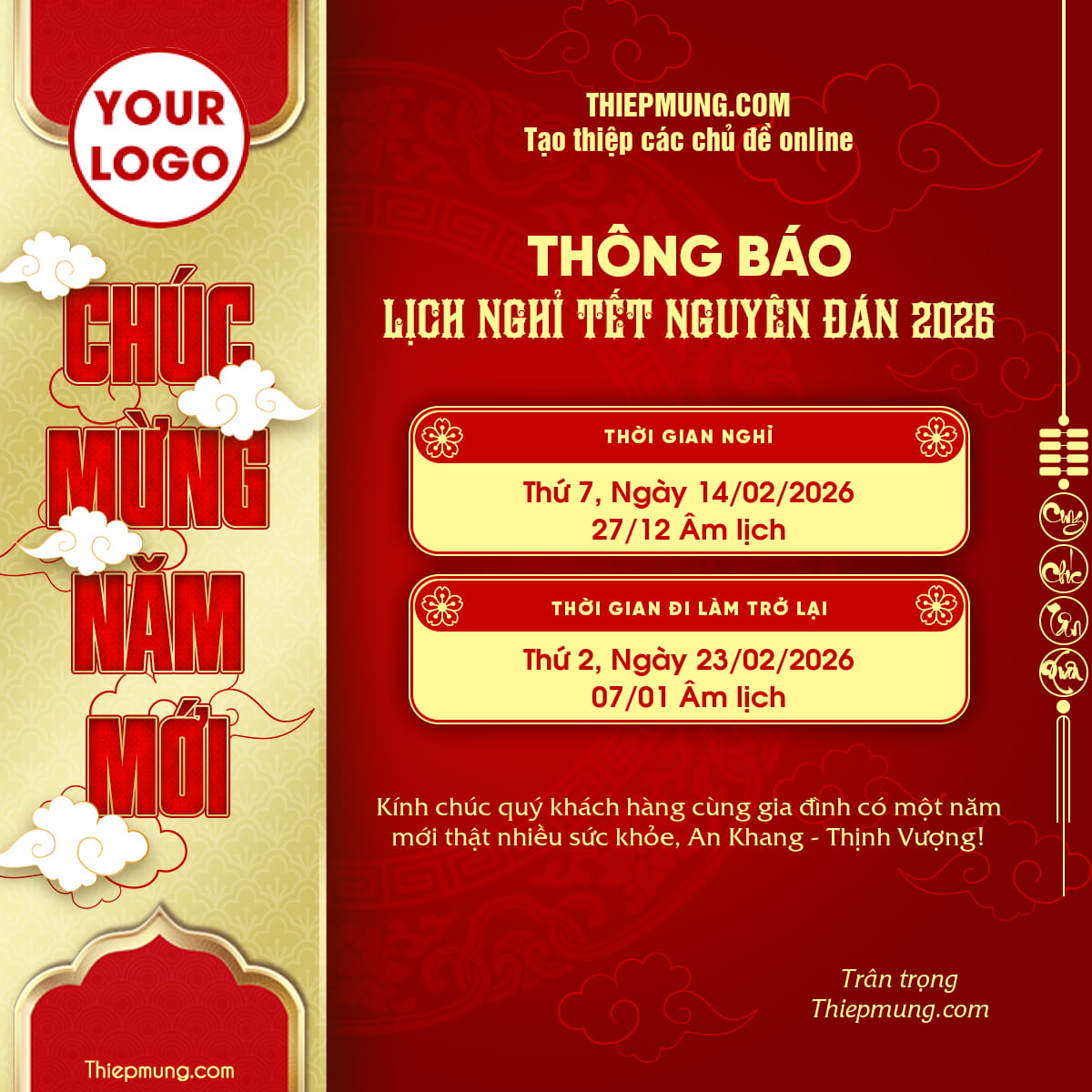 Mẫu thông báo lịch nghỉ Tết Nguyên Đán 2026 thiết kế chuyên nghiệp phong cách truyền thống, bố cục rõ ràng, nổi bật thời gian nghỉ và ngày đi làm trở lại theo cả dương lịch và âm lịch. Phù hợp cho doanh nghiệp, cửa hàng, công ty, trường học đăng tải trên website, mạng xã hội hoặc in ấn dịp Tết.