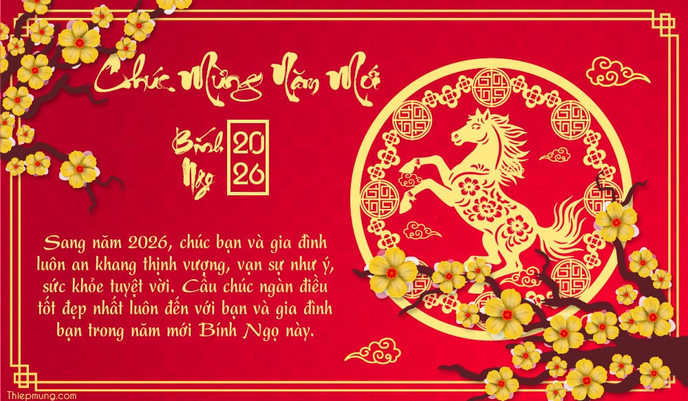 Thiệp chúc Tết hoa mai 2026 mới nhất với thiết kế mang đậm nét truyền thống. Với tiện ích này bạn chỉ cần nhập lời chúc của mình là có ngay một tấm thiệp Tết Bính Ngọ gửi đến bạn bè và người thân.