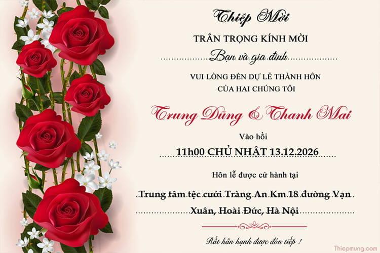 Mẫu thiệp cưới hoa hồng đỏ đẹp lãng mạn và sang trọng, tạo thiệp cưới online miễn phí mẫu hoa hồng cho bạn gửi lời mời đám cưới đến bạn bè cũng như thông báo đám cưới đén người thân trên MXH trực tuyến. Tiện ích tạo thiệp cưới cho các đôi uyên ương cực hot mà bạn có thể tạo và tải miễn phí.