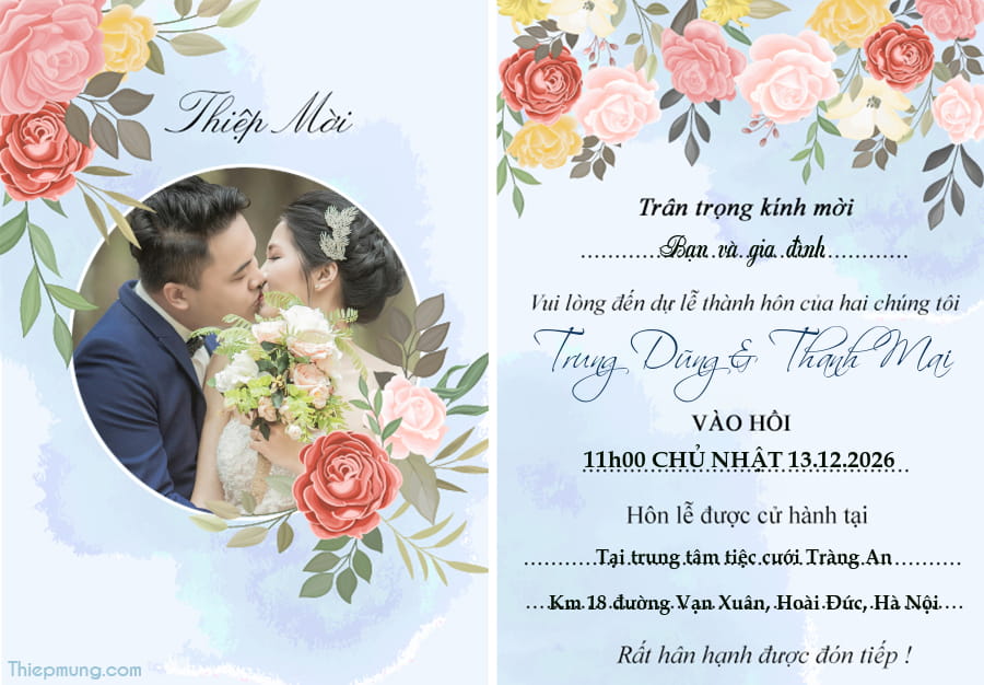 Công cụ tạo thiệp mời đám cưới đẹp với ảnh. Tiện ích tạo thiệp mời đám cưới online mẫu hoa sang trọng và ý nghĩa sẽ gây ấn tượng với khách mời của bạn. Tùy chỉnh lời mời với tên, thời gian và địa điểm trên mẫu khung có sẵn thật dễ dàng. Một lời mời chân thành và tấm thiệp cưới được tạo và gửi đi sẽ khiến ngày vui của bạn trở nên trọn vẹn khi nhận được vô vàn lời chúc phúc từ bạn bè và người thân.