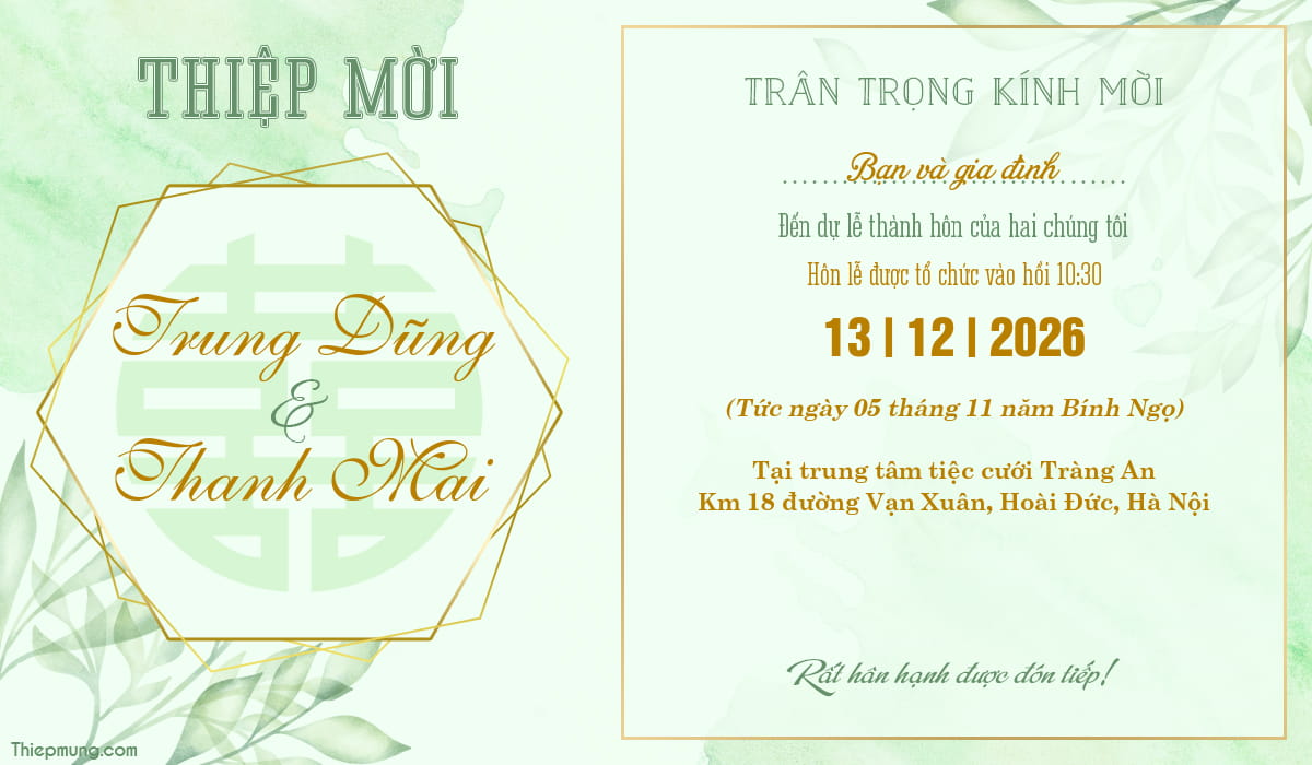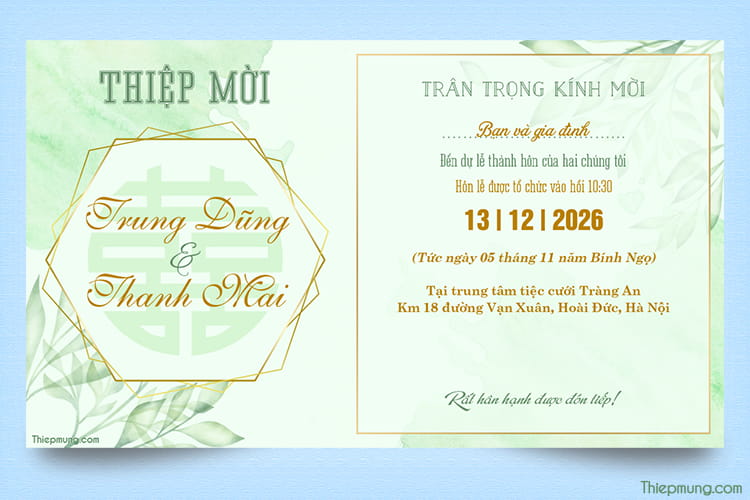 Mang thiên nhiên về trong thiết kế thiệp mời đám cưới của bạn. Tạo thiệp cưới màu xanh lá cây, họa tiết thiệp cưới trang trí floral tuyệt đẹp là một trong những mẫu thiệp cưới hiện đại phổ biến hiện nay. Viết thông tin trên thiệp cưới này và gửi cho bạn bè, người thân đến chung vui trong ngày kết hôn trọng đại của bạn nhé.
