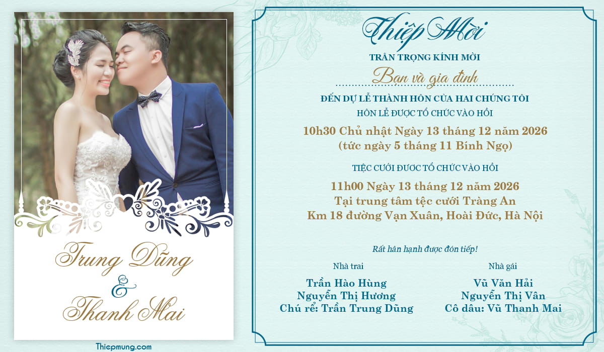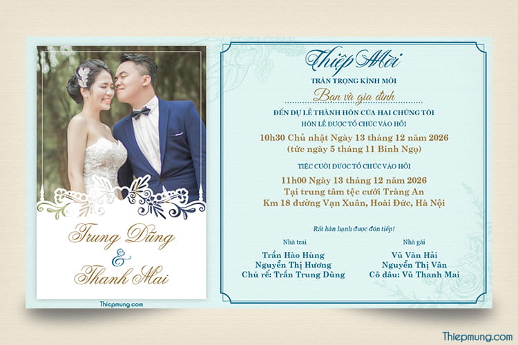 Mẫu thiệp cưới tông xanh pastel trang nhã, thiết kế sang trọng kèm ảnh cô dâu chú rể. Bố cục rõ ràng, nội dung thiệp mời lễ thành hôn và tiệc cưới đầy đủ thông tin thời gian, địa điểm. Phù hợp in thiệp cưới truyền thống hoặc tạo thiệp online chuyên nghiệp.