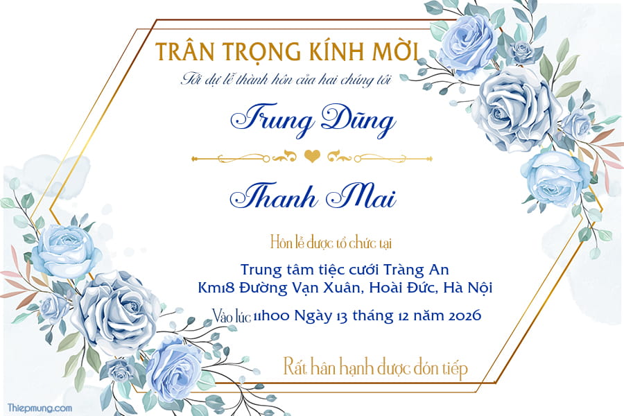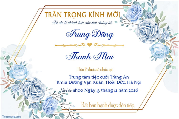 Tiện ích tạo thiệp cưới online mẫu hoa sang trọng và độc đáo sẽ giúp bạn chia sẻ niềm vui, gửi lời mời đám cưới đến bạn bè, người thân trên MXH một cách lịch sự nhất. Thiết kế thiệp cưới điện tử cho ngày trọng đại của bạn dễ dàng và miễn phí chỉ có tại Thiệp Mừng, xu hướng tạo thiệp mời cưới hỏi đang được các bạn trẻ cực kỳ yêu thích.