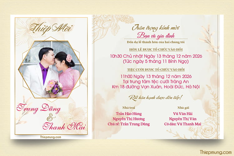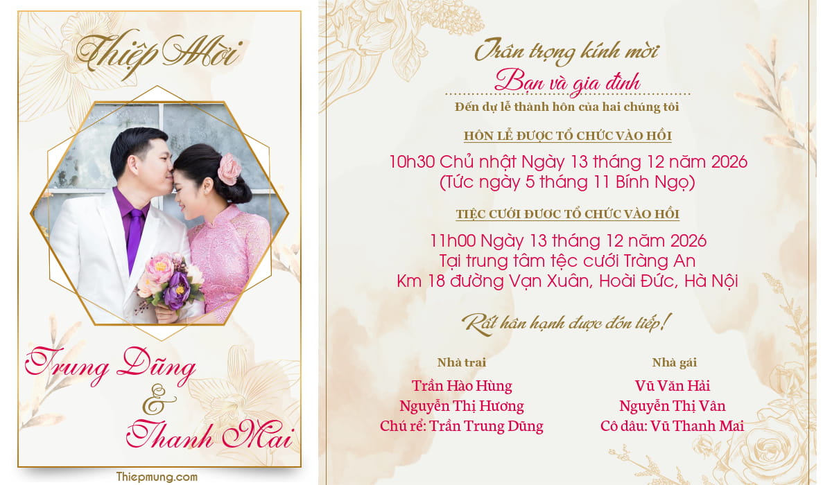 Tạo thiệp mời, lời mời đám cưới của riêng bạn trong vài phút với tiện ích tạo lời mời cưới trực tuyến. Bạn có thể tải miễn phí hình ảnh thiệp cưới này, in hoặc chia sẻ trực tuyến trên mạng xã hội để thông báo đến mọi người về ngày vui của hai bạn.
