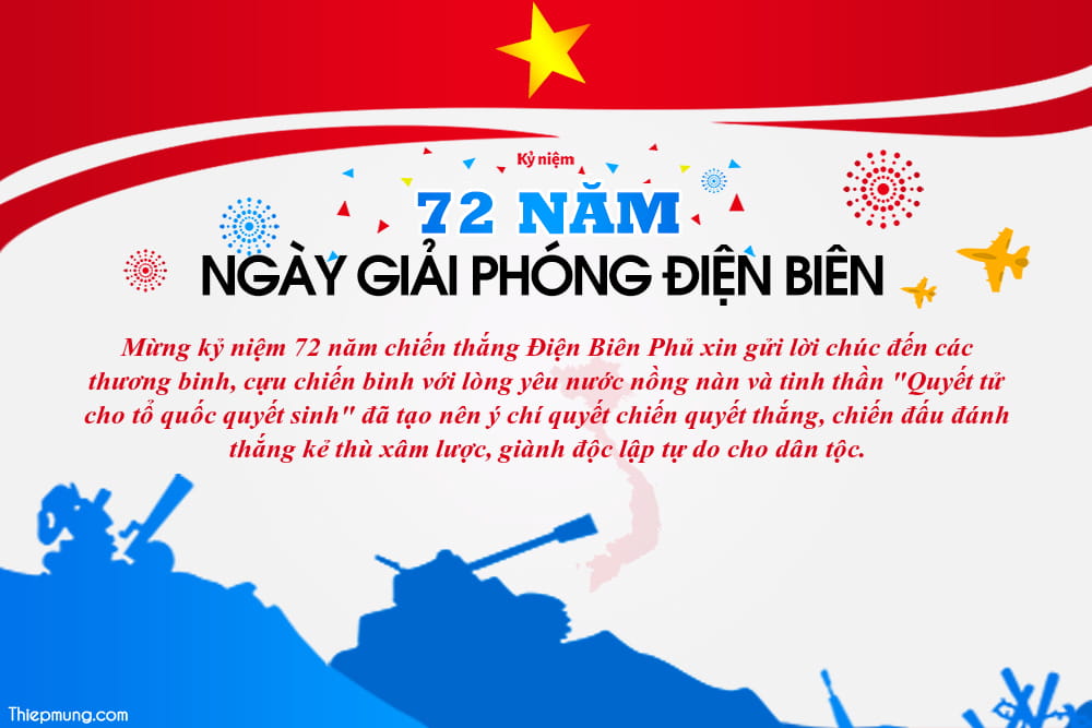 Hằng năm, gần đến dịp kỷ niệm Chiến thắng Điện Biên Phủ, tỉnh Điện Biên nói riêng và cả nước nói chung nỗ lực đẩy mạnh các hoạt động tri ân, đền ơn đáp nghĩa. Nếu bạn đang tìm kiếm những tấm thiệp chúc Chiến thắng Điện Biên Phủ (7/5/1954- 7/5/2026) đẹp ý nghĩa nhất, hãy gửi những thiết kế thiệp chúc mừng ý nghĩa cho mọi người trong ngày lễ đặc biệt này. Tạo thiệp chúc mừng 72 năm Chiến thắng Điện Biên Phủ miễn phí mới nhất 2026.