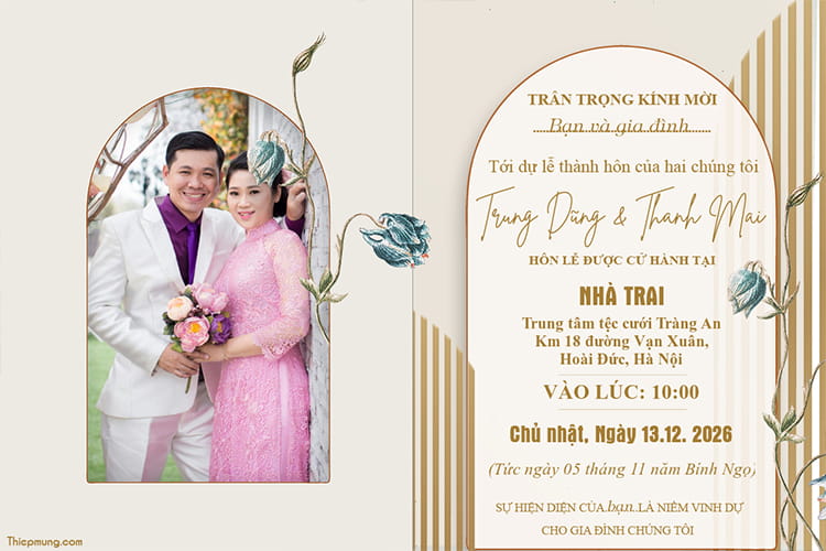 Làm mẫu thiệp mời đám cưới sang trọng cho đám cưới của bạn. Tạo thiệp mời đám cưới cho sếp, bạn bè, đồng nghiệp một cách lịch sự với trình tạo thiệp mời đám cưới online miễn phí của Thiệp Mừng. Kỷ niệm ngày cưới của bạn và để mọi người kỷ niệm ngày trọng đại của bạn bằng thiệp mời đám cưới do chính bạn tạo và chia sẻ. Lời mời đám cưới này sẽ khiến cho bất kỳ ai phải trầm trồ kinh ngạc đó.