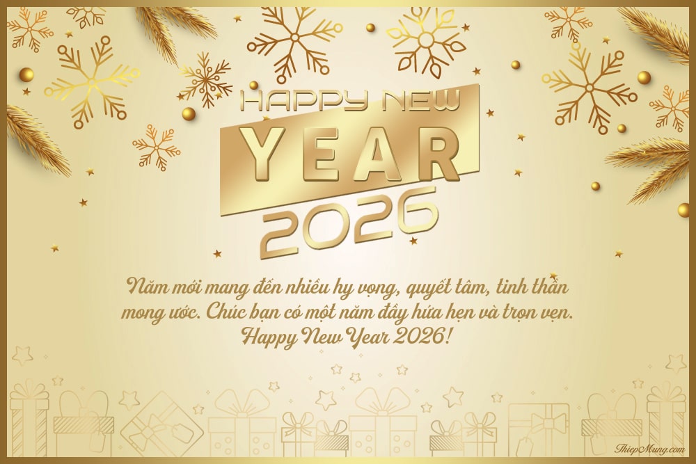 Mẫu thiệp chúc mừng năm mới 2026 thiết kế tông vàng sang trọng, điểm xuyết họa tiết bông tuyết và quà tặng mang không khí ấm áp đầu năm. Mẫu thiệp 2026 tinh tế, phù hợp gửi tặng bạn bè, đồng nghiệp, người thân hoặc chia sẻ chúc Tết trực tuyến.