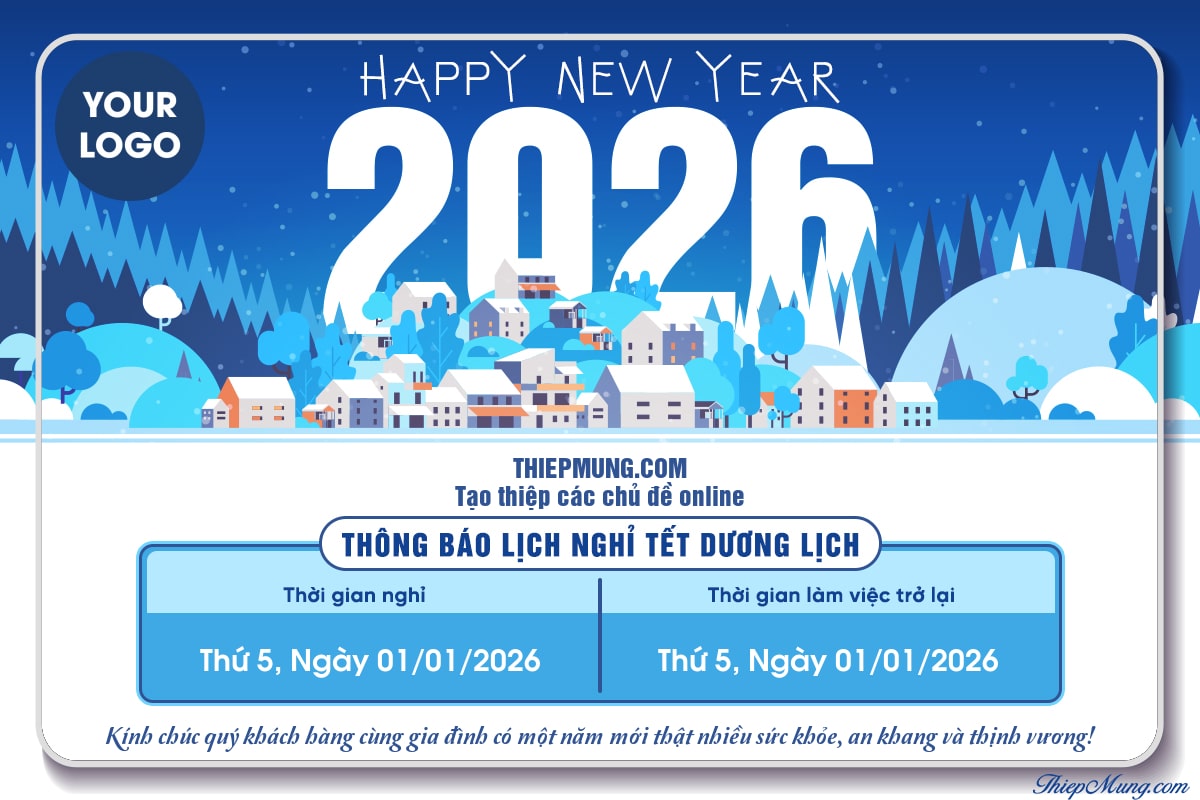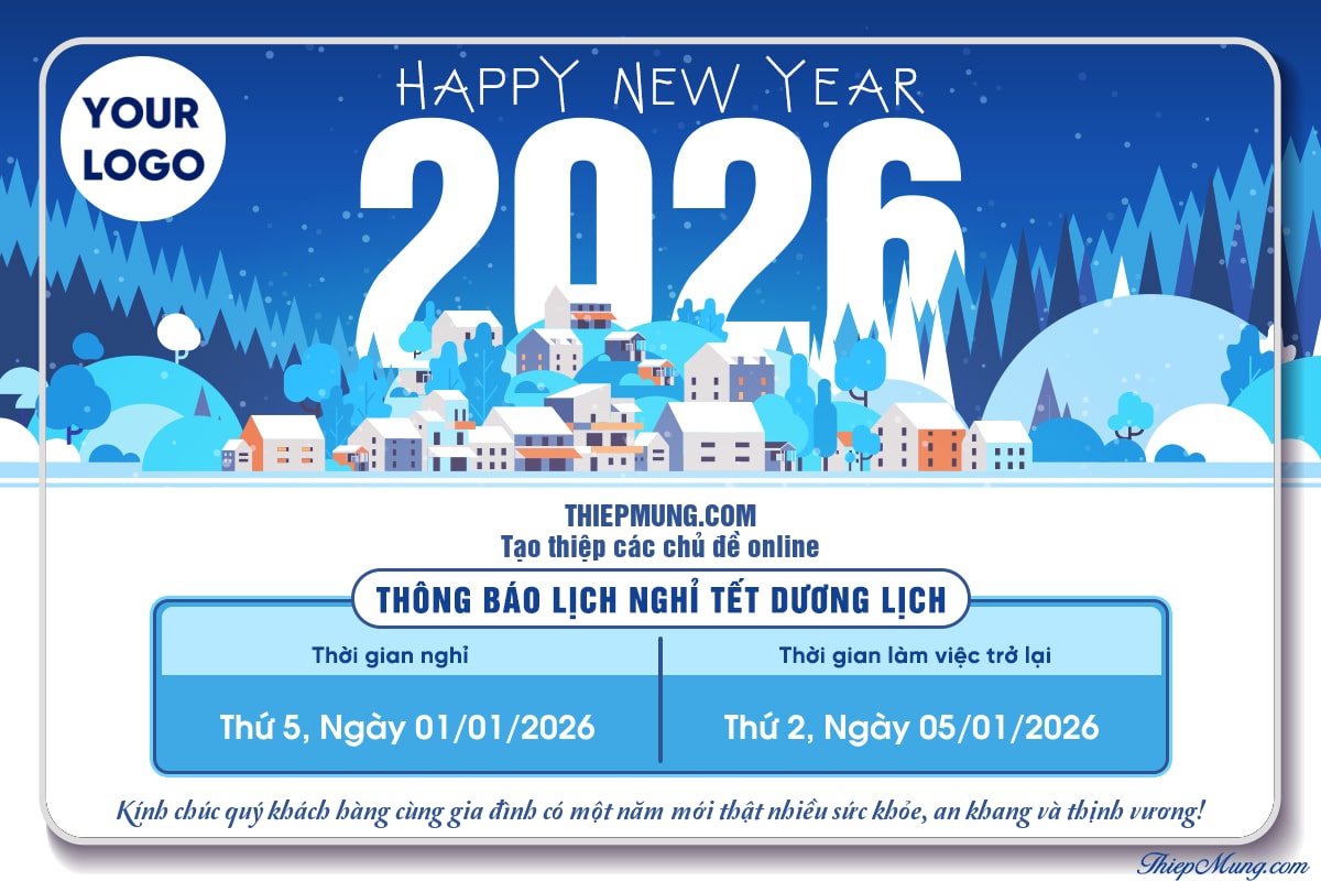 Mẫu thông báo nghỉ Tết Dương Lịch 2026 được thiết kế theo phong cách hiện đại với tông màu xanh mùa đông, hình ảnh ngôi làng tuyết và con số 2026 nổi bật. Phù hợp cho doanh nghiệp, công ty, cửa hàng sử dụng để thông báo lịch nghỉ Tết Dương Lịch đến khách hàng và nhân viên. Bố cục rõ ràng, dễ đọc, có thể tùy chỉnh logo, nội dung và tải về sử dụng miễn phí.