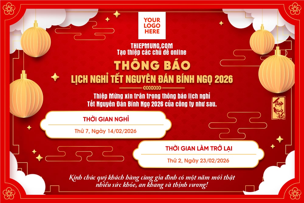 Nghỉ Tết Nguyên Đán hay còn gọi Tết âm là một trong những dịp nghỉ lễ có thời gian kéo dài nhiều ngày. Do vậy mà mỗi đơn vị cần có thông báo cụ thể về lịch trình làm việc và nghỉ lễ cụ thể trong những ngày này để người lao động và khách hàng được biết. Với mẫu thông báo lịch nghỉ Tết Nguyên Đán chuyên nghiệp cho trung tâm giáo dục và doanh nghiệp các bạn đã có một thông báo đầy đủ chi tiết và đẹp mắt. Chỉ mất một chút thời gian các bạn đã có thể tạo trực tuyến và tải về thiết bị của mình.