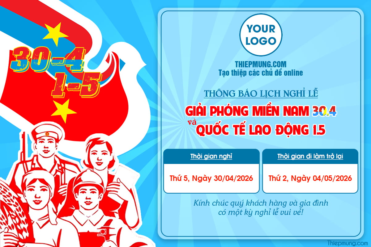 Tạo thông báo nghỉ lễ 30-4 và 1-5 có logo và tên công ty, tổ chức online