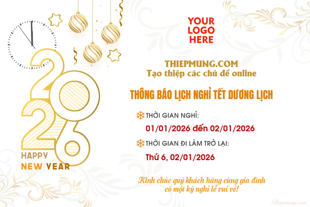 Tết Dương lịch nhiều doanh nghiệp, cơ sở kinh doanh... có thể không làm việc và sẽ cần một mẫu thông báo lịch nghỉ Tết Dương lịch 2026 để nhân viên nội bộ và khách hàng tiện theo dõi. Để giúp mọi người kịp thời thông báo tới khách hàng Thiệp Mừng chia sẻ đến các bạn mẫu thông báo nghỉ Tết Dương Lịch đơn giản và chuyên nghiệp có đầy đủ thông tin trên một thông báo.