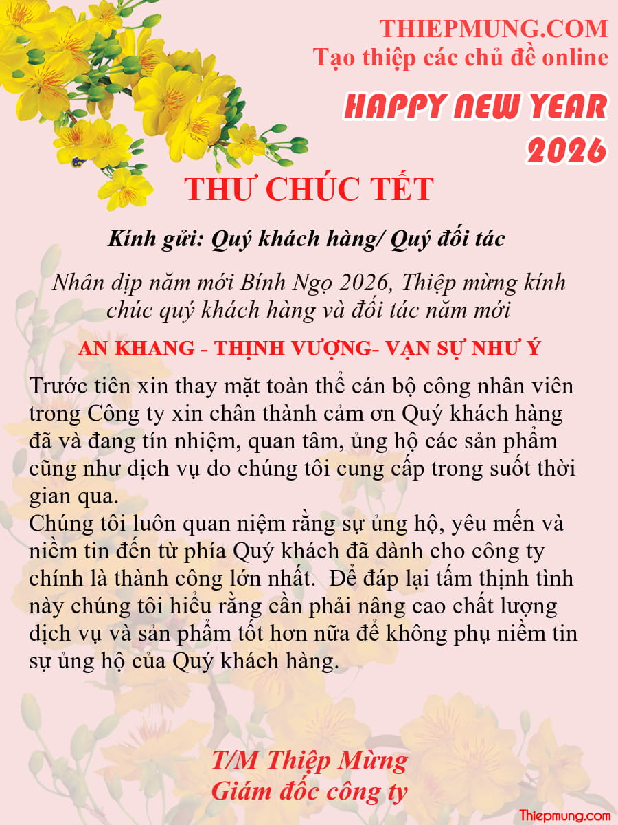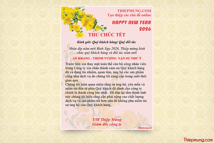 Chia sẻ đến bạn mẫu thư chúc Tết 2026 mẫu hoa mai vàng sang trọng, lịch sự. Viết thư chúc Tết 2026 cho khách hàng, đối tác, tiện ích tạo và tải hình ảnh thư chúc Tết năm mới Bính Ngọ 2026 ý nghĩa cho bạn gửi lời tri ân tới những người đã đồng hành cùng công ty trong suốt một năm. Thiết kế thư ngỏ chúc Tết đẹp mới nhất từ Thiệp Mừng.