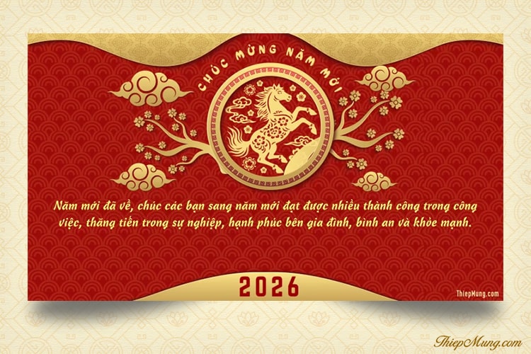 Tùy chỉnh lời chúc trên video chúc Tết năm mới Bính Ngọ 2026 với Ngựa vàng trên nền đỏ may mắn. Tạo video chúc Tết 2026 đẹp nhất mang lời chúc thật hay thật ý nghĩa dành tặng cho những người thân yêu. Lời chúc Tết 2026 độc đáo như món quà tinh thần đầy may mắn cho người đón nhận. Hãy cùng Thiệp Mừng tạo video chúc Tết 2026 đẹp với lời chúc sẽ là món quà ý nghĩa cho ai đó vào dịp tết này.