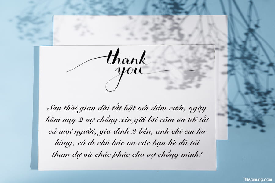 Không gì tuyệt vời hơn khi sau đám cưới, 2 bạn dành chút thời gian tạo thiệp cảm ơn sau đám cưới và gửi đến bạn bè và người thân thay cho lời tri ân chân thành sau đám cưới khi mà bạn không thể nói trực tiếp. Mẫu thiệp cảm ơn đám cưới online đơn giản, lịch sự giúp bạn dễ dành viết nội dung lên thiệp và gửi trực tuyến trên MXH rất tiện lợi.