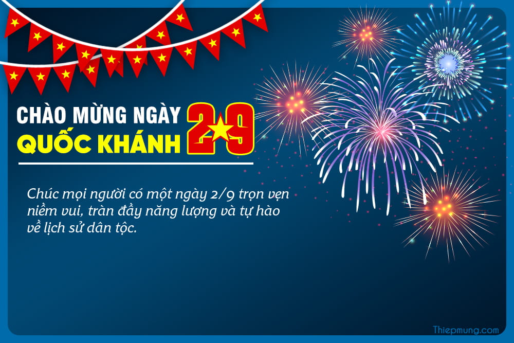 Trang trí thiệp chúc mừng ngày Quốc khánh 2/9 với pháo hoa và cờ tổ quốc. Mẫu thiệp chúc mừng 2/9, hình ảnh thiệp pháo hoa đẹp với lời chúc, thông điệp kỷ niệm 80 năm ngày Việt Nam độc lập. Vào ngày Tết độc lập của dân tộc ta, mọi người thường trao gửi nhau những tấm thiệp chúc mừng ý nghĩa. Truy cập Thiệp Mừng để tạo và chia sẻ thiệp chúc mừng Ngày quốc khánh 2/9 đẹp nhất.