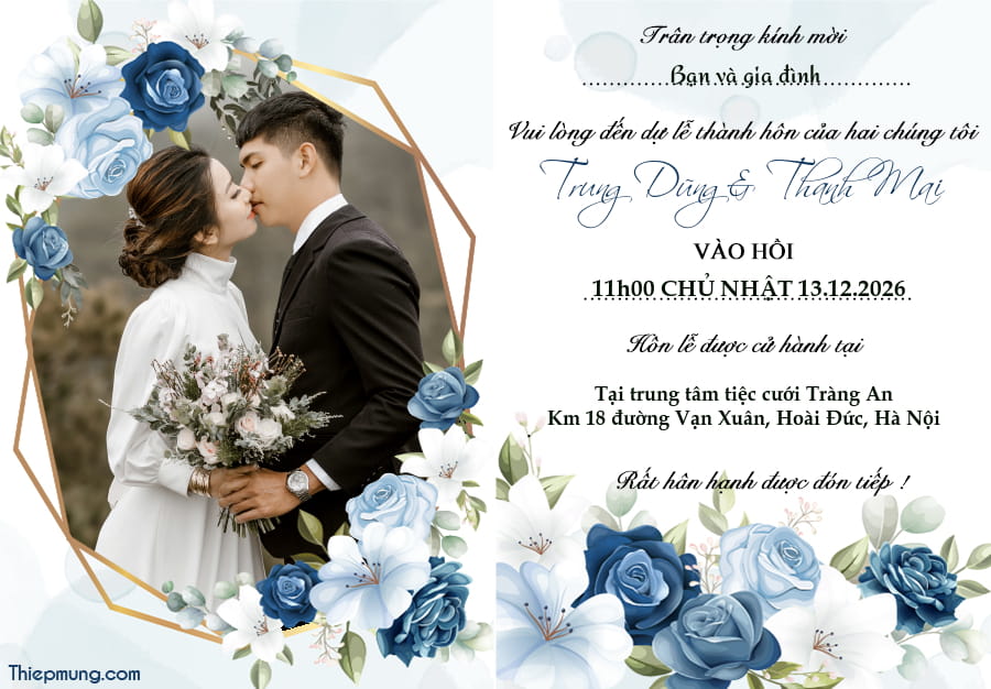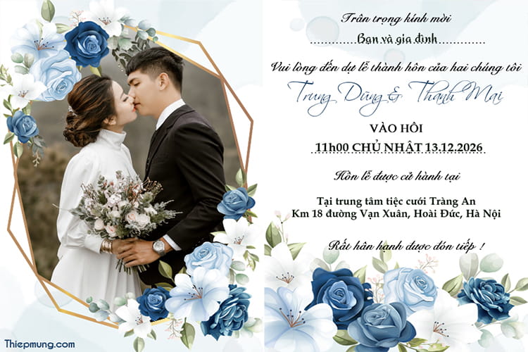 Tinh tế với mẫu thiệp cưới hoa xanh, tự thiết kế nội dung thiệp mời đám cưới của bạn với ảnh cưới của hai bạn, công cụ tạo thiệp cưới online hàng đầu hiện nay đang rất được yêu thích. Để có một ngày cưới hoàn hảo cần chuẩn bị rất nhiều, và nếu có những người bạn ở xa không thể gửi lời mời trực tiếp, hãy tạo và chia sẻ hình ảnh thiệp cưới đẹp và độc đáo này để tạo ra ấn tượng với khách mời của bạn nhé.