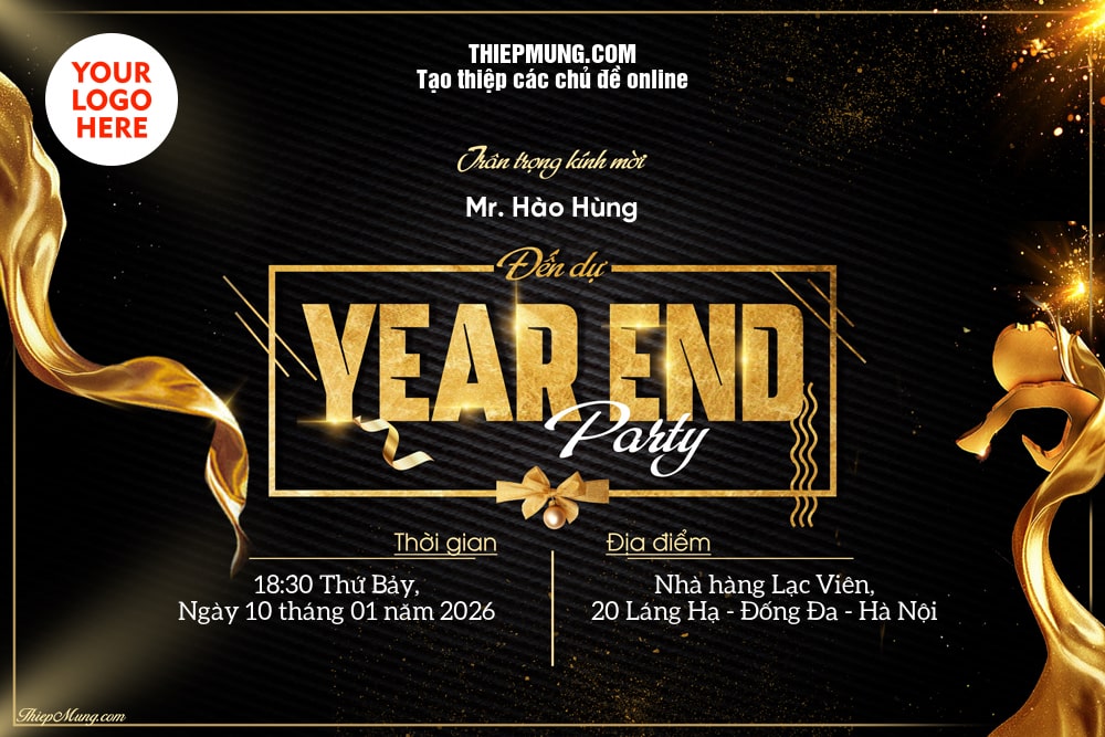 Mẫu thiệp mời Year End Party thiết kế sang trọng với tông đen vàng ánh kim nổi bật, phong cách hiện đại và chuyên nghiệp. Phù hợp cho tiệc cuối năm công ty, gala dinner, sự kiện doanh nghiệp. Dễ dàng tùy chỉnh tên khách mời, thời gian, địa điểm và logo trực tuyến.