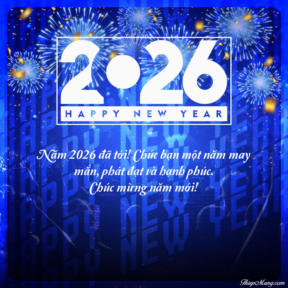 Chào đón năm 2026 với mẫu thiệp chúc mừng năm mới rực rỡ sắc màu pháo hoa. Thiệp năm mới 2026 thiết kế hiện đại, tông màu xanh sang trọng, mang ý nghĩa chúc phúc và niềm vui đầu năm. Gửi đến bạn bè, người thân, đồng nghiệp thiệp năm mới 2026 để cùng nhau đón chào một khởi đầu tràn đầy năng lượng và thành công.