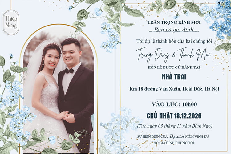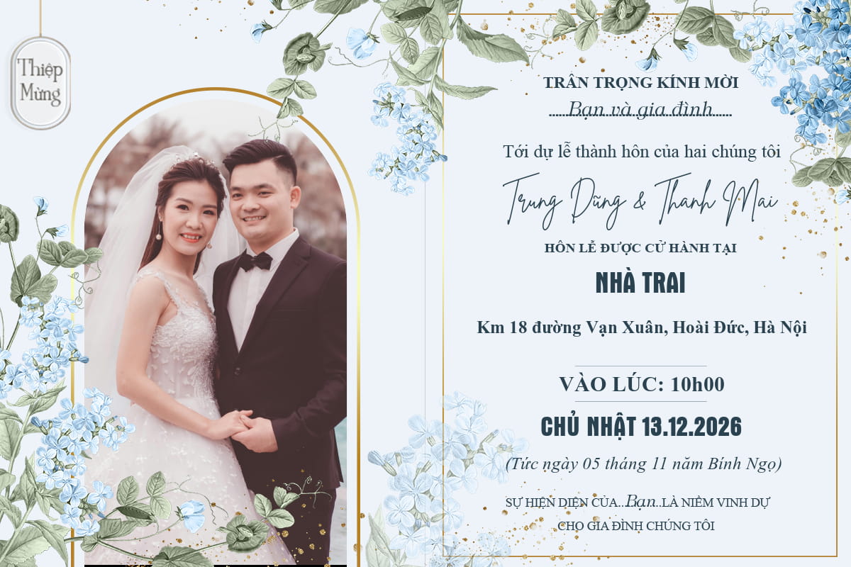 Thật dễ dàng để thiết kế thiệp mời cho ngày đặc biệt của bạn với công cụ tạo thiệp cưới trực tuyến miễn phí. Mẫu thiệp cưới màu với hoa lá màu xanh hiện đại có ảnh cô dâu chú rể. Tùy chỉnh thiệp mời đám cưới online bằng cách thêm nội dung thư mời và ảnh với phông chữ nghệ thuật! Chọn thiết kế thiệp mời lễ thành hôn đẹp nhất, thiệp mời dự tiệc và làm thiệp cưới của riêng bạn!