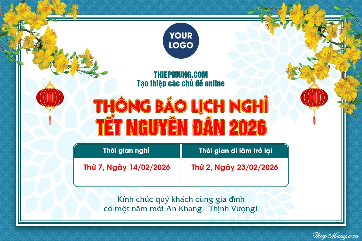 Mách bạn cách tạo thông báo lịch nghỉ Tết Nguyên Đán 2026 cho công ty, doanh nghiệp đơn giản nhất. Tạo thông báo nghỉ Tết 2026 đẹp mẫu mới được dùng phổ biến cho nội bộ các công ty, khách hàng, cơ quan hành chính, trường học hay các cửa hàng kinh doanh. Nhập tên công ty và làm theo hướng dẫn là bạn đã có thể sở hữu những thiết kế thông báo nghỉ Tết 2026 chất lượng và chuyên nghiệp nhất.