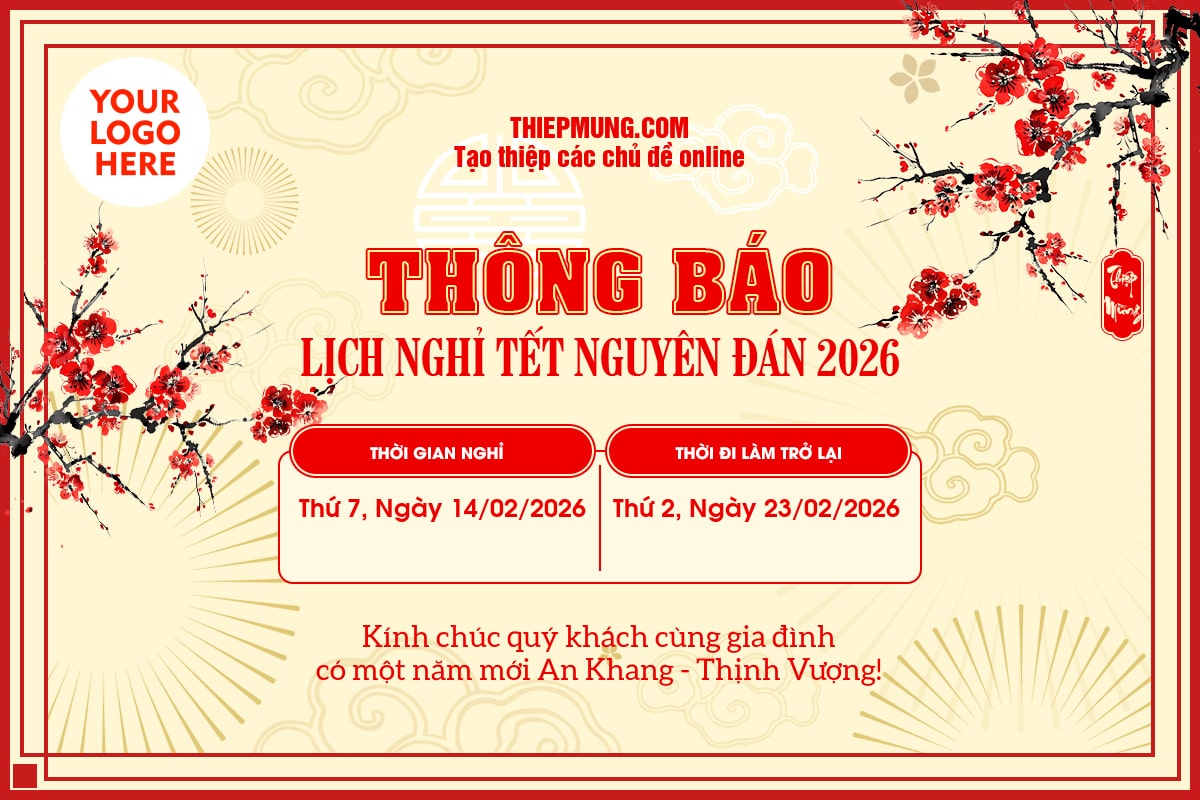 Tải logo công ty trên mẫu thông báo lịch nghỉ Tết đẹp mới nhất 2026. Mẫu thông báo lịch nghỉ Tết 2026 chất lượng với mẫu thông báo trên nền hoa đào và mâm quả Tết. Ngày Tết là một trong những thời điểm quan trọng trong năm để các công ty, doanh nghiệp tạo và chia sẻ mẫu thông báo lịch nghỉ Tết đẹp ấn tượng đến khách hàng và đối tác. Duyệt qua bộ sưu tập các mẫu thiệp thông báo lịch nghỉ Tết đẹp nhất 2026 online miễn phí từ Thiệp Mừng.