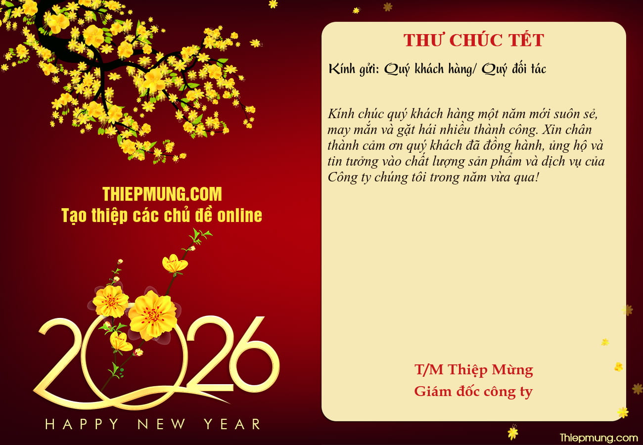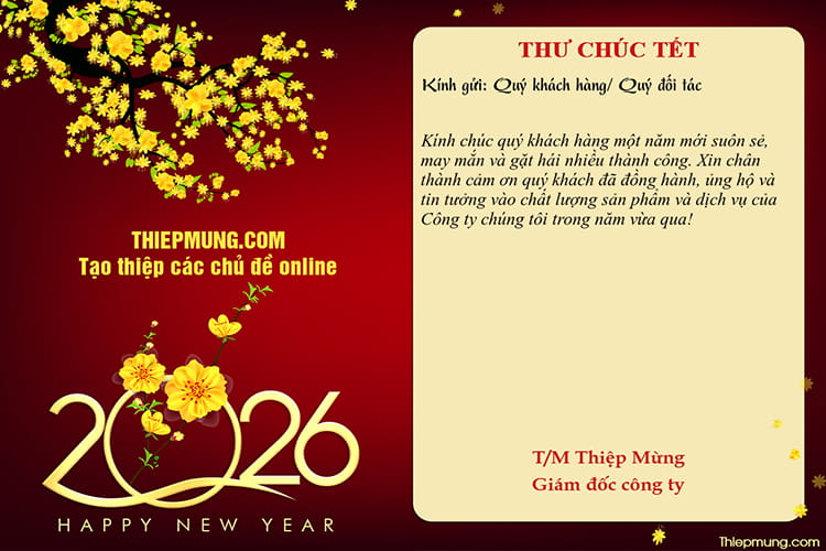 Bạn đang tìm kiếm thư chúc Tết khách hàng hay nhất? Ở đây Thiệp Mừng chia sẻ miễn phí đến bạn mẫu thư chúc Tết 2026 đẹp và ý nghĩa mẫu hoa mai để bạn gửi lời cảm ơn và chúc Tết khách hàng, đối tác vào xuân Bính Ngọ này. Mẫu thư chúc Tết 2026 đẹp và miễn phí. Chọn từ hang chục mẫu thư chúc Tết năm mới đẹp từ khi Thiệp Tết của chúng tôi.