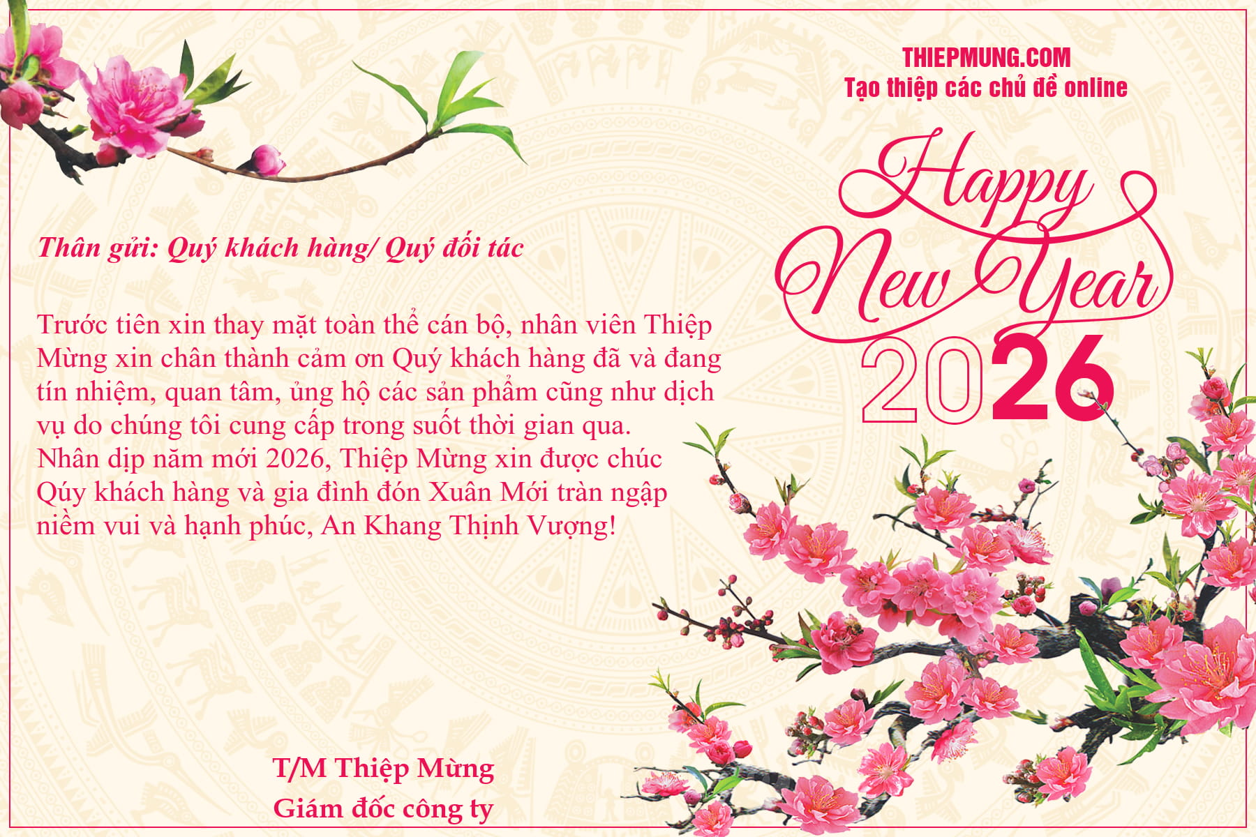 Nhân dịp năm mới Bính Ngọ, cùng Thiệp Mừng tạo và chia sẻ những mẫu thư chúc Tết 2026 đẹp gửi tới khách hàng, đối tác. Mẫu thư chúc Tết khách hàng với nền hoa đào tươi thắm cùng nội dung lời chúc của bạn. Thật tuyệt vời khi dịp cuối năm này, bạn có thể tiết kiệm thời gian, chi phí thiết kế để tạo nên những hình ảnh thư chúc Tết 2026 tuyệt đẹp từ Thiệp Mừng.