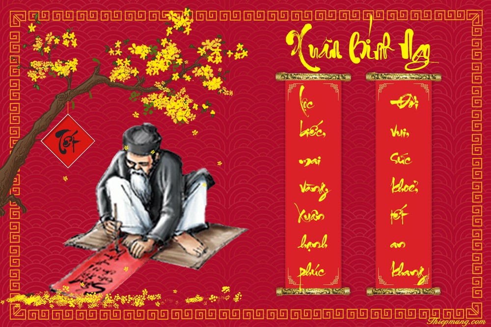 Mỗi năm hoa đào nở, lại thấy ông đồ già. Hình ảnh ông đồ già từ bao giờ đã trở nên thật quen thuộc và là điều thường thấy mỗi dịp Tết đến xuân về. Cùng Thiệp Mừng tạo hình ảnh thư pháp chúc Tết 2026 với hình ảnh ông đồ và câu đối Tết. Mẫu thiệp thư pháp câu đối tết với cành mai vàng khoe sắc và câu đối tết tâm đắc của bạn là món quà chúc tết cổ truyền độc đáo không đụng hàng mà cực kỳ ý nghĩa cho bạn bè, người thân, ông bà và cha mẹ,...