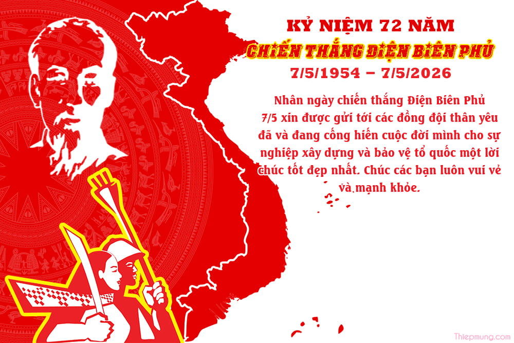 Chia sẻ thiết kế mới nhất thiệp kỷ niệm 72 năm Chiến thắng Điện Biên Phủ (7/5/1954- 7/5/2026) năm nay. Tạo thiệp chúc mừng giải phóng Điện Biên Phủ miễn phí, hình ảnh thiệp chúc mừng ngày kỷ niệm 72 năm Chiến thắng Điện Biên Phủ đẹp ý nghĩa với lời chúc sẽ là món quà tuyệt vời bày tỏ lòng biết ơn đến công lao của những người anh hùng đã hi sinh vì tổ quốc, các cựu chiến binh,... Chọn từ những thiết kế thiệp chúc mừng chiến thắng Điện Biên Phủ có sẵn từ Thiệp Mừng.