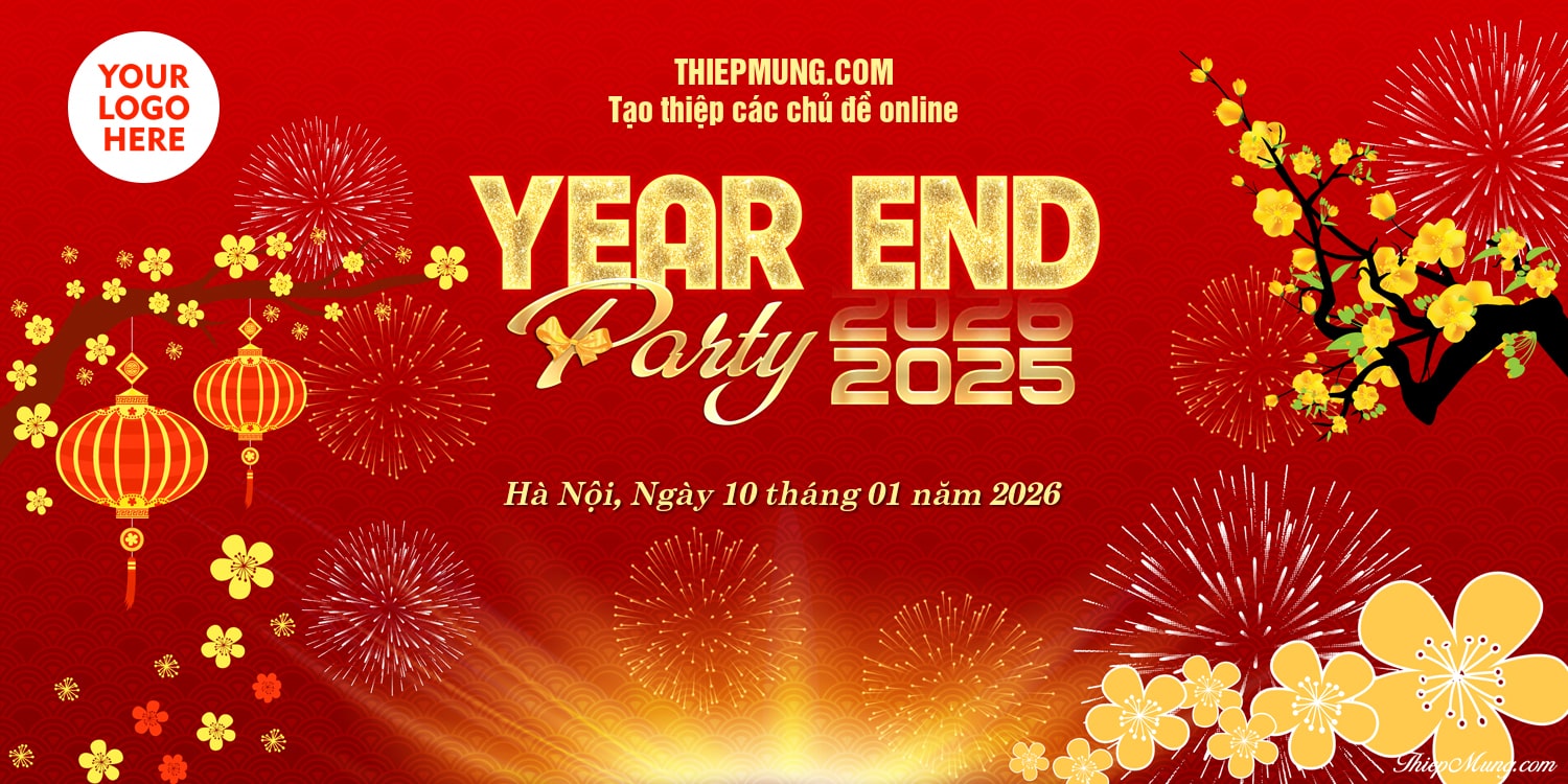Tạo và tải miễn phí mẫu backdrop tất niên 2025 mới nhất cho năm nay. File backdrop year end party 2025 mới nhất cho năm 2026 được thiết kế với nền đỏ với hoa mai ngày tết và pháo hoa. Tổ chức tiệc tất niên là sự kiện nội bộ được mong chờ nhất trong năm của công ty, doanh nghiệp. Hãy để sự kiện này diễn ra thật hoàn hảo với mẫu thiết kế backdrop cuối năm ấn tượng mới nhất từ Thiệp Mừng.